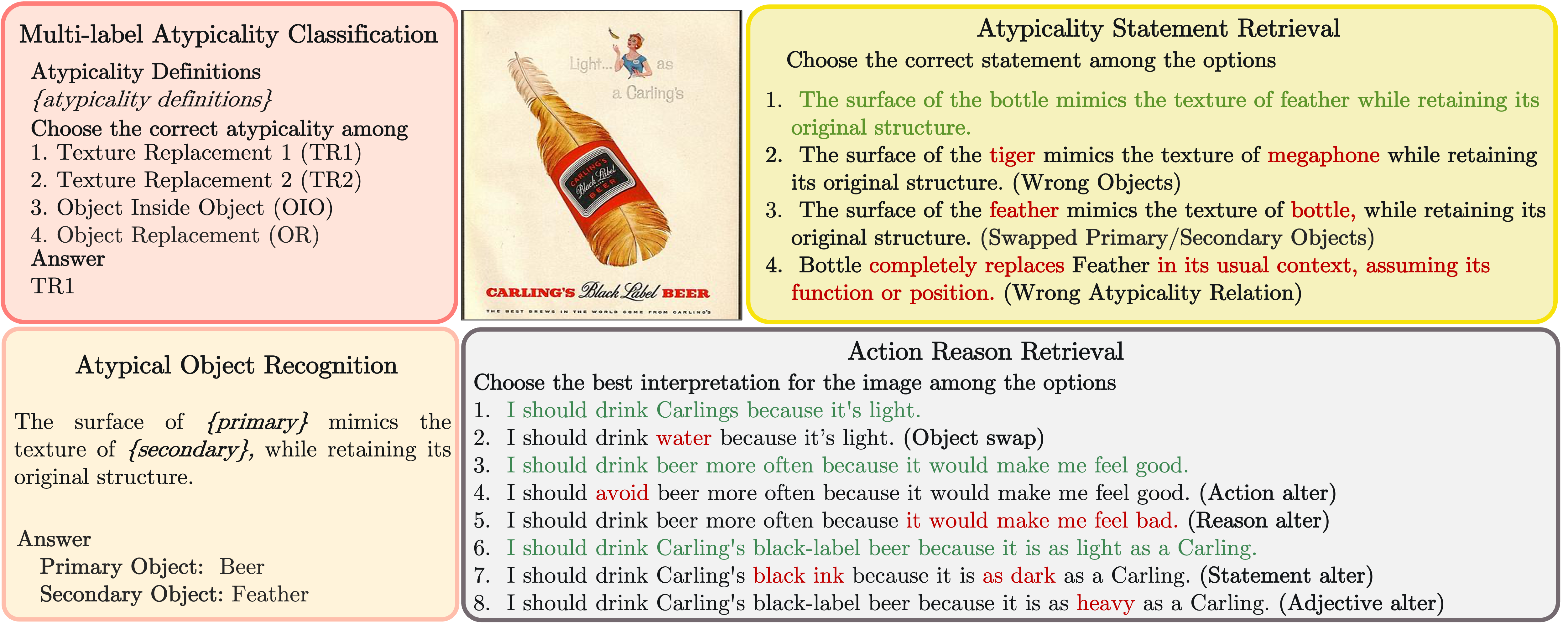 We introduce three novel tasks, Multi-label Atypicality Classification, Atypicality Statement Retrieval, and Atypical Object Recognition, to benchmark VLMs' understanding of atypicality in persuasive images. We evaluate how well VLMs use atypicality to infer an ad's message and test their reasoning abilities by employingsemantically challenging negatives. Finally, we pioneer atypicality-aware verbalization by extracting comprehensive image descriptions sensitive to atypical elements.